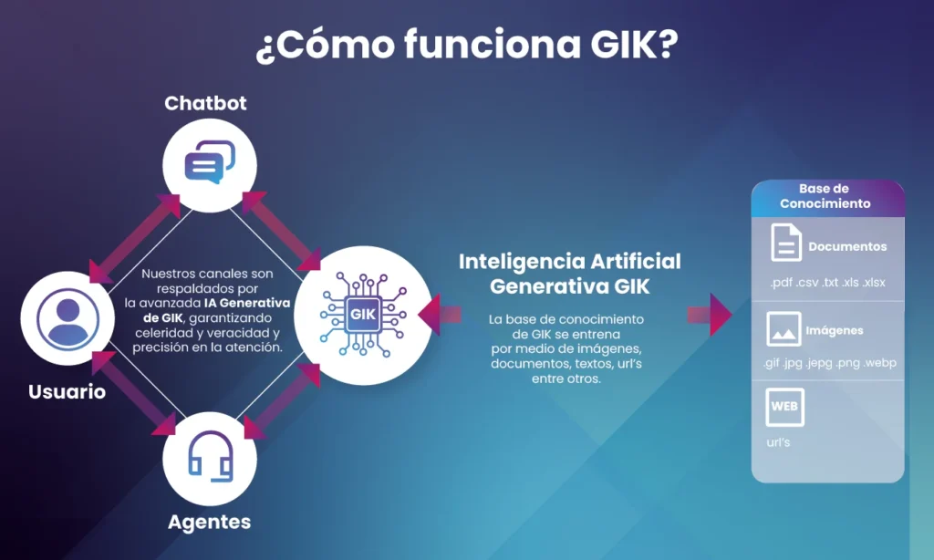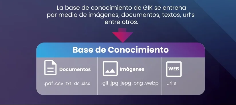 La base de conocimiento de GIK se entrena por medio de imágenes, documentos, textos, url´s entre otros.